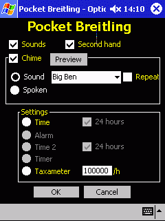 How to make a custom chime or alarm sound: Use a low quality wave file and name it "chimeWhatever.wav" for chime sounds, and "alarmWhatever.wav" for alarm sounds and place the file on your PDA in the Pocket Breitling\sounds directory. The easiest way to create sound files is probably to use the built-in sound recording. |
